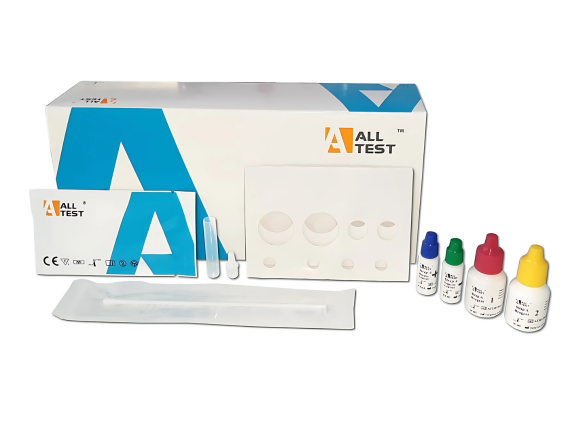 Cette image présente le contenu complet du kit TROD Angine de la marque ALLTEST. La boîte contient 25 cassettes de test, des écouvillons, des tubes et plusieurs flacons de réactif de différentes couleurs, destinés à faciliter la détection rapide de l’angine. La date limite d’utilisation est fixée à juin 2026, garantissant une bonne conservation et une utilisation fiable pour le diagnostic.